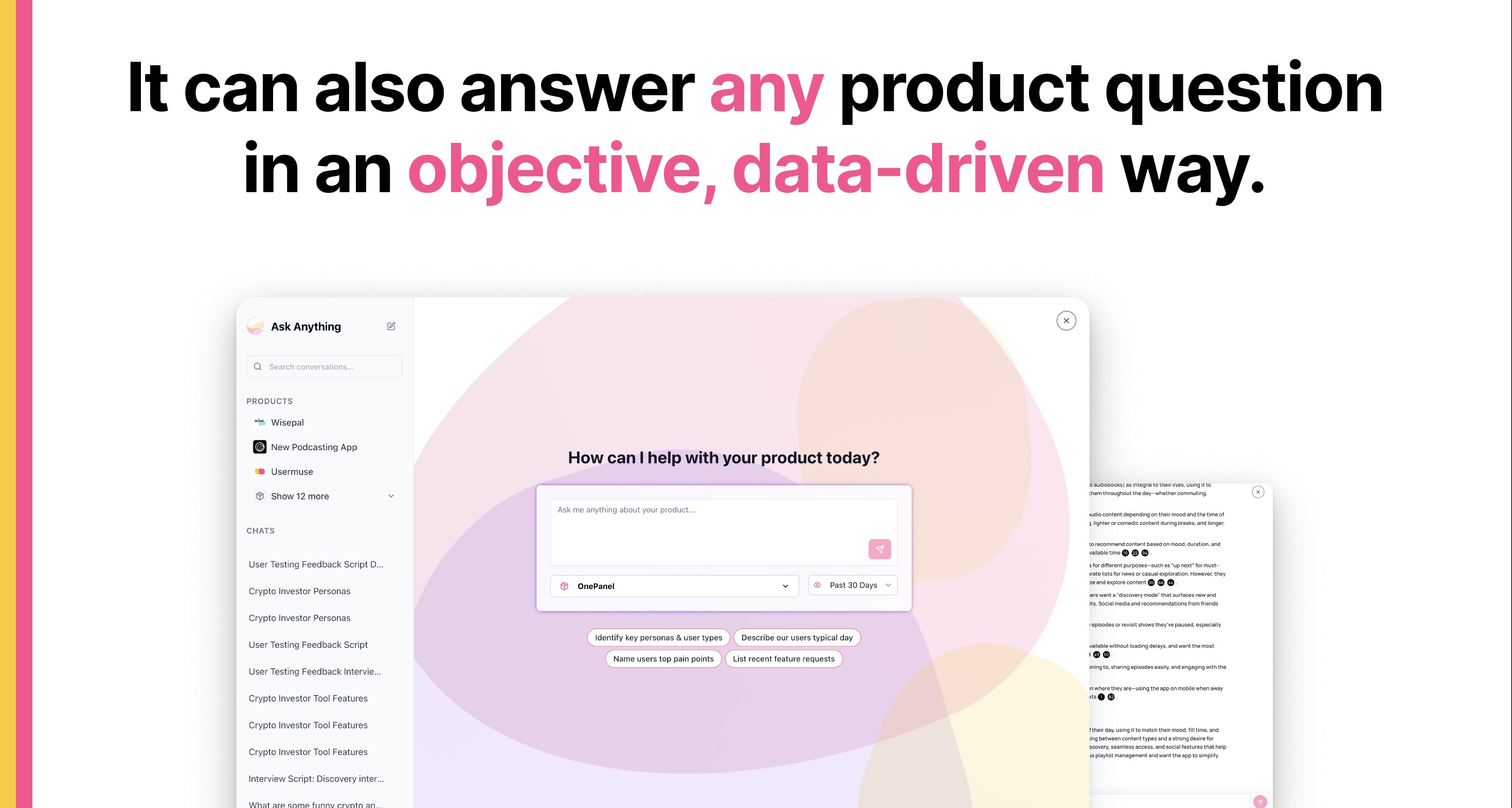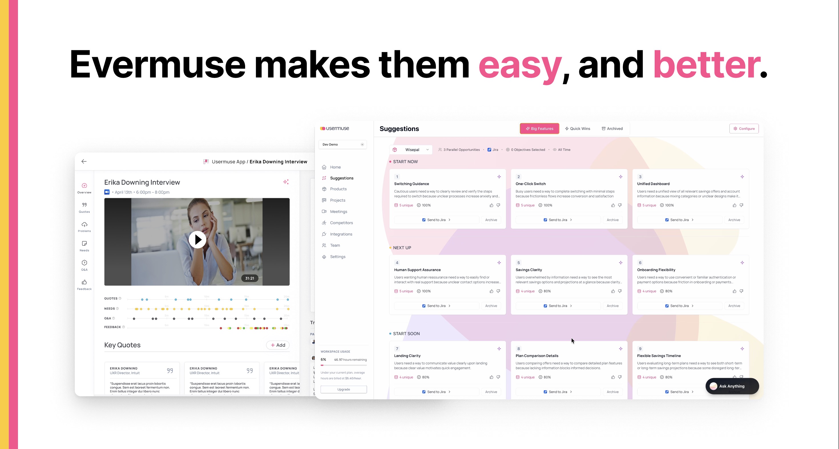 Evermuse | Mid-Size Companies (51-1,000 employees) | Evermuse is an AI advisor that turns customer calls into roadmap suggestions, to speed product creation. Evermuse ingests Sales, Customer Success, and Product team conversations with customers via upload, via direct recording in meeting platform (e.g., Zoom, Teams, & Meet), and via pre-existing call recorders (e.g., Gong & Chorus). Evermuse parses those calls into the signals that Product teams cares about (e.g. needs, pain point, key quotes, &… | N/A |