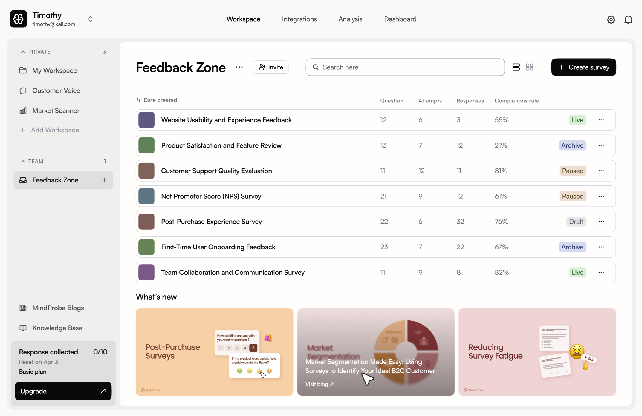 MindProbe | N/A | MindProbe is a market research platform for B2C teams. It enables marketing, product, and strategy professionals to design surveys, collect consumer responses, and analyse results without relying on agencies, lengthy procurement cycles, or manual data processing. Key Features MindProbe offers 30+ question types with advanced logic and branching, giving teams the flexibility to build research for any objective. Surveys… | $0 per month (for 1 seat & 10 surveys) |
