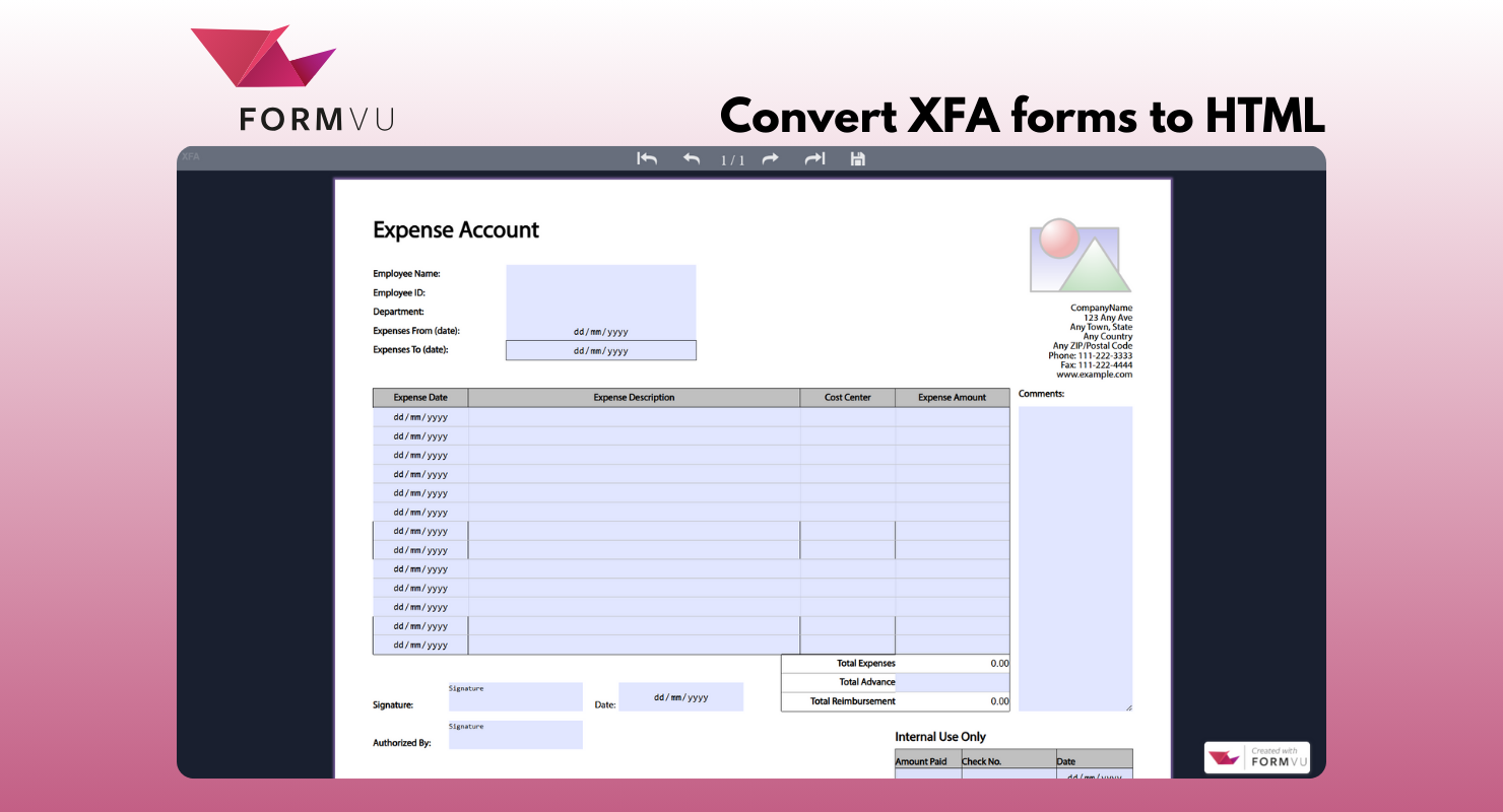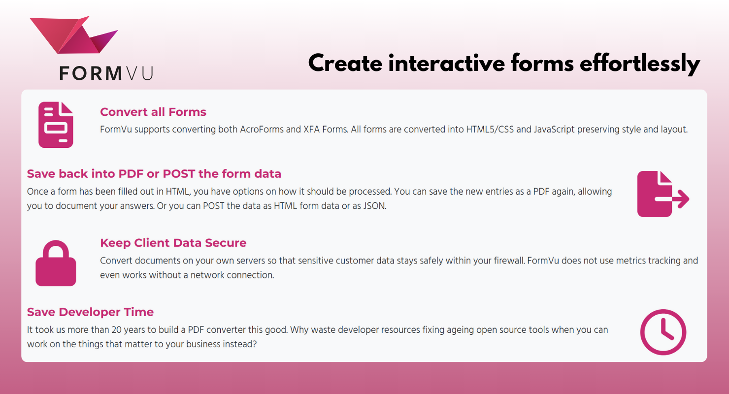 FormVu | N/A | FormVu is an SDK designed to convert PDF Form files into standalone HTML with interactive form components. Here are some of its key features: -Interactive Conversion: Converts PDF forms into HTML while retaining their appearance and functionality. -Data Security: Runs on a company's own servers, ensuring customer data remains secure and private. -Versatile Integration: Supports both AcroForms and XFA Forms and can be integrated into web applications. -Flexible Output: Allows… | $1,800 per month 500 documents per day | |