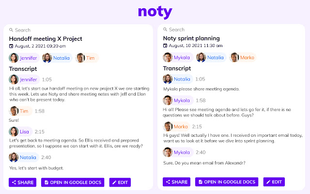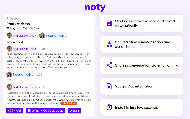 Noty.ai | N/A | Live Meetings Transcription and Analytics Noty extension automatically transcribes Google Meet calls and generates summaries, tasks and events. Transcripts are available in English, Spanish, French, German, Portuguese. How it Works - Install Noty extension - Start Google Meet in Chromium browser (Google Chrome, Opera, Brave, Microsoft Edge) - Get a real-time transcript (an easily readable format, speakers labeling, timecodes) - Get… | N/A |