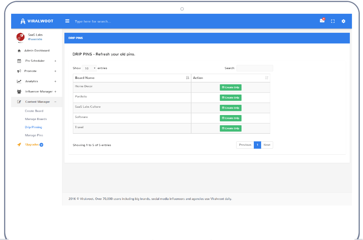 Viralwoot | Enterprise companies (1,001+ employees) | Viralwoot allows users to automate Pinterest marketing and schedule pins. Users can schedule, promote and analyze their complete Pinterest performance from the Viralwoot dashboard. Additionally, users can monitor the performance of their competitors on Pinterest and take their Pinterest marketing to next level. | $10 per month |