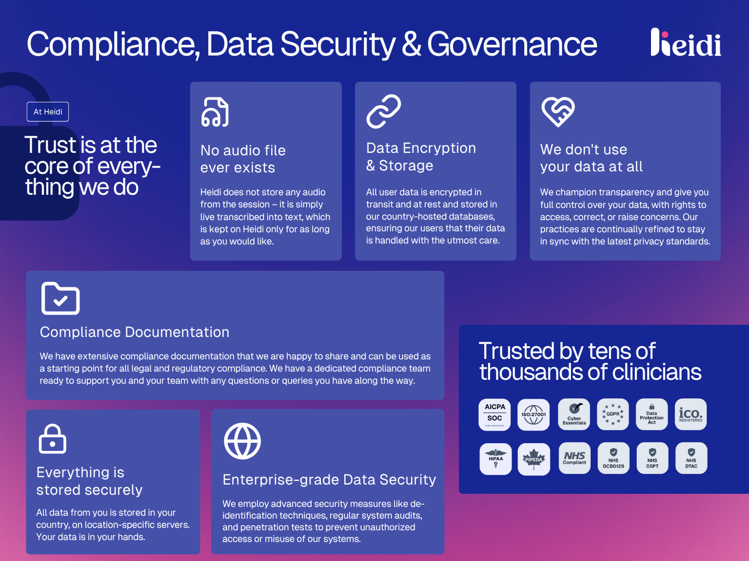 Heidi | N/A | Heidi’s AI-powered medical scribe streamlines administrative tasks to reduce the cognitive load on clinicians. Heidi's technology transcribes and processes conversations between clinicians and patients to produce clinical notes and follow-up materials, from referral letters to medical assessments. Heidi adapt's to the user's voice, and: Works across 200+ medical specialties Adapts to any personal terminology and… | $99 per month per user | |