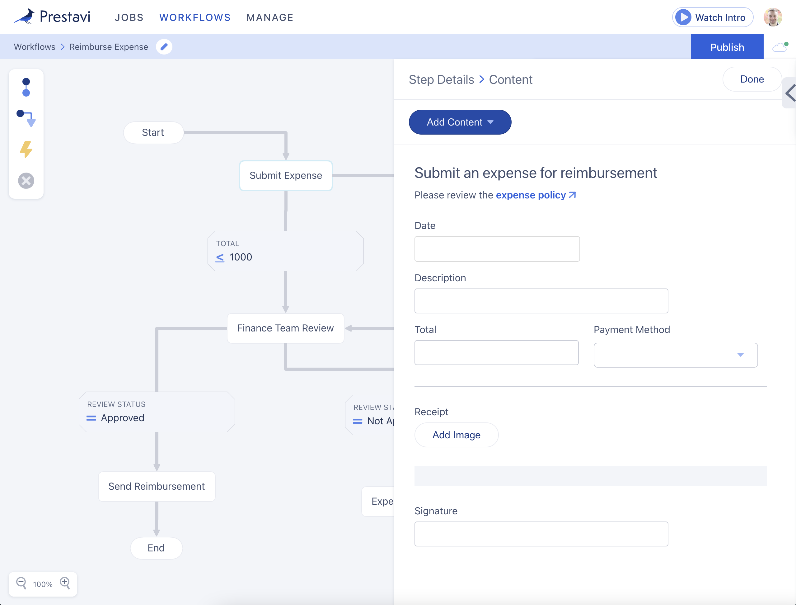Prestavi | N/A | Prestavi enables customers, vendors and employees to follow business processes in a step by step format. The user can create custom workflows with a drag and drop editor. Prestavi is designed to help the user guarantee that customers, vendors and employees always goes through the intended processes. | $20 per month | |