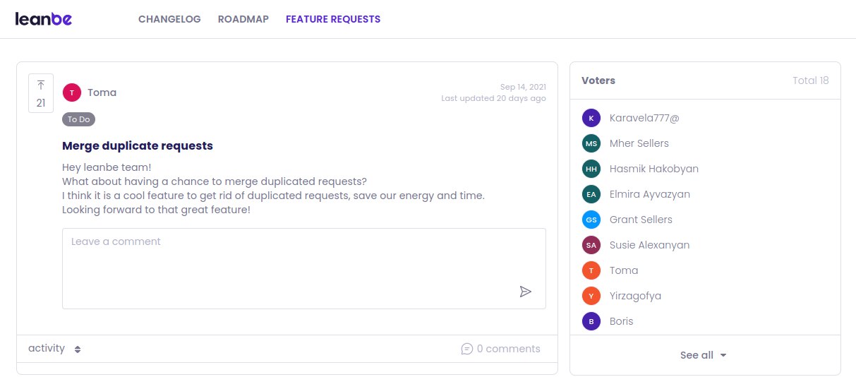 Leanbe | N/A | Leanbe is a feedback collection and data-driven product roadmap creation platform Leanbe is presented as a smart tool covering all the 3 steps in the product development cycle: feedback collection, roadmap generation and user notification. Thus the full loop of data collection, analysis and planning the future actions is based on a data-driven and user-oriented approach. Leanbe is a platform that helps collect feedback & feature requests, generate a roadmap & notify users about… | N/A |