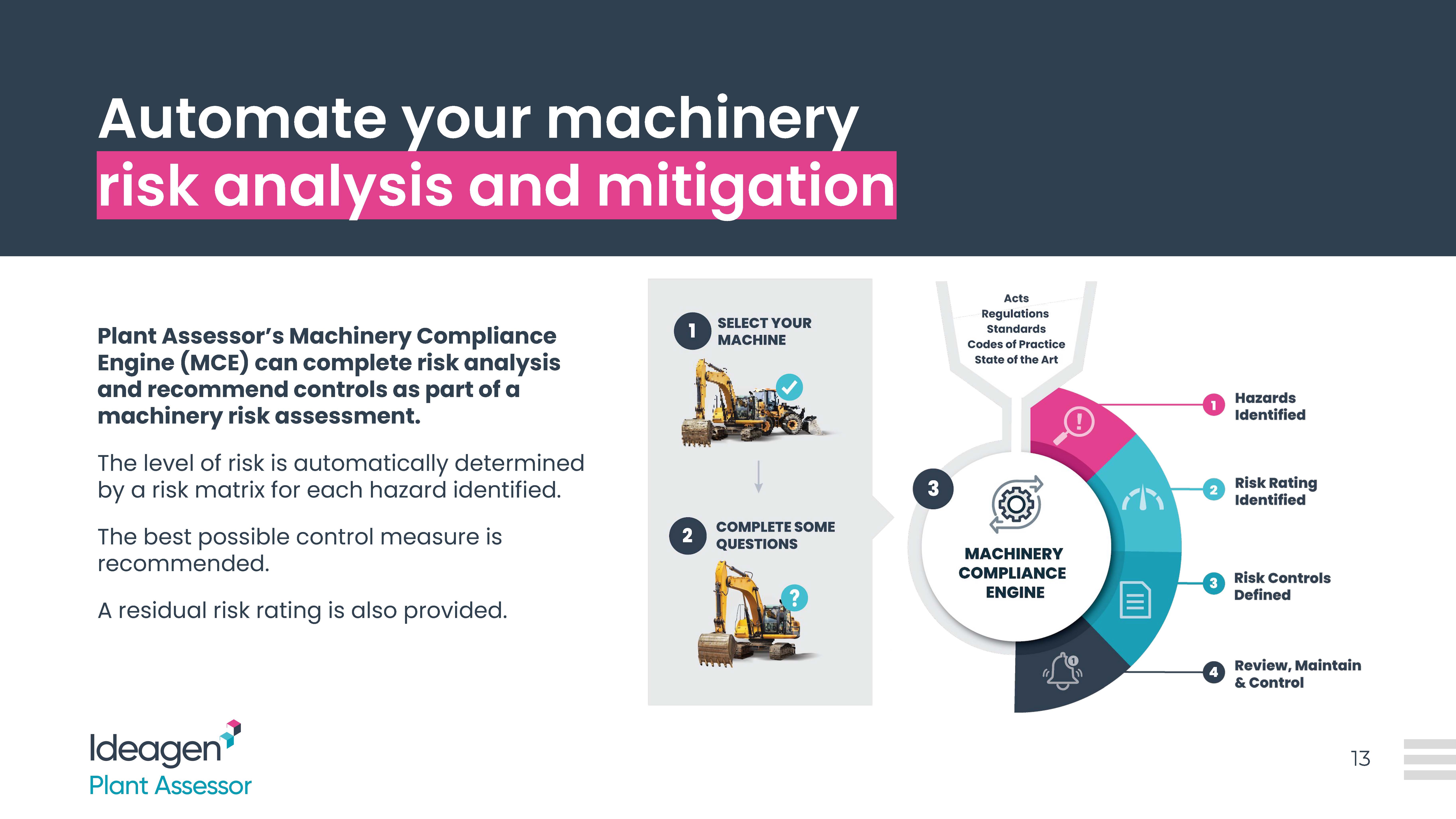 Ideagen Machine Safety | N/A | Ideagen Plant Assessor is a machinery safety and compliance software that helps businesses operating or supplying machinery meet compliance, keep people safe, and improve operational productivity. Protecting people and businesses The software helps organizations to remain audit-ready with organised record-keeping, by facilitate communication of safety information from office to site, and by helping to ensure machinery compliance is fully under… | $0 | |