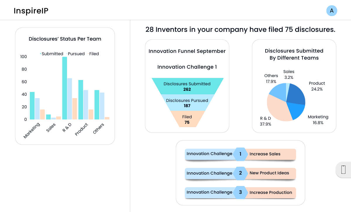 InspireIP | N/A | InspireIP aims to make idea and innovation management intuitive with platforms built to support user growth. It is presented as ideal for businesses needing to tap into the innovation pool, break free from a lack of collaboration, and keep ideas and inventions on one platform. The company's Idea Assist is used to capture ideas across organizations, team verticals, and global teams and implement them without compromising quality and feasibility. IP Assist can also be used… | $150 per month 100 users | |