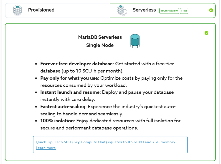 Screenshot of instance, Storage, ReplicasScreenshot of Sky Ai agentsScreenshot of Serverless Single NodeScreenshot of Monitoring