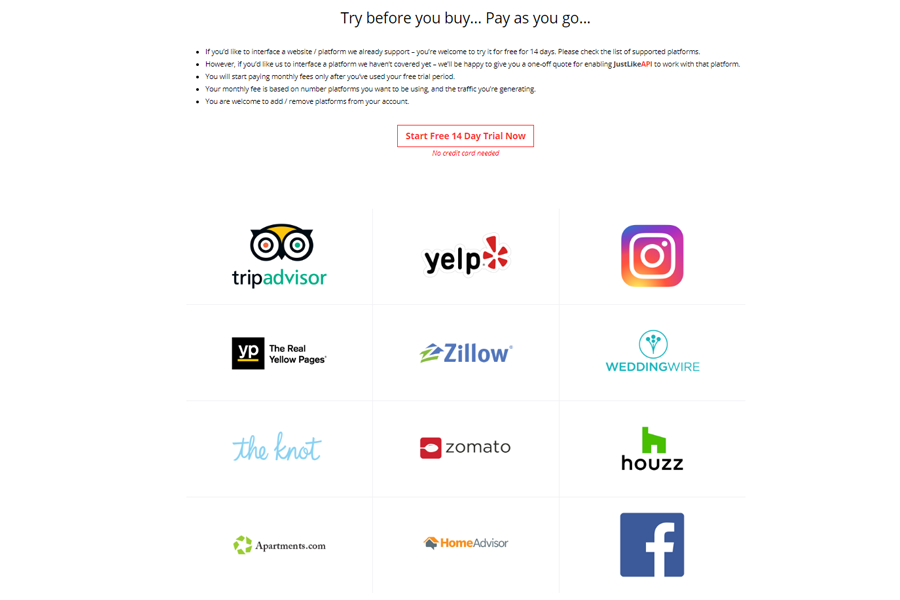justLikeAPI | Enterprise companies (1,001+ employees) | JustLikeAPI is an advanced data crawling / data scraping API service enabling IT companies. The vendor provides review aggregation services to their clients to access, monitor, analyze and respond to reviews, or other data related to user accounts – across dozens of sites from a single place. According to vendors, JustLikeAPI is great at monitoring bot-aware websites displaying desired information only… | N/A |