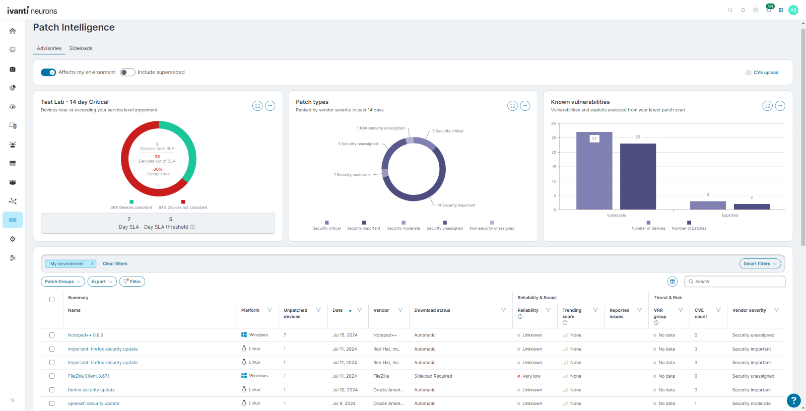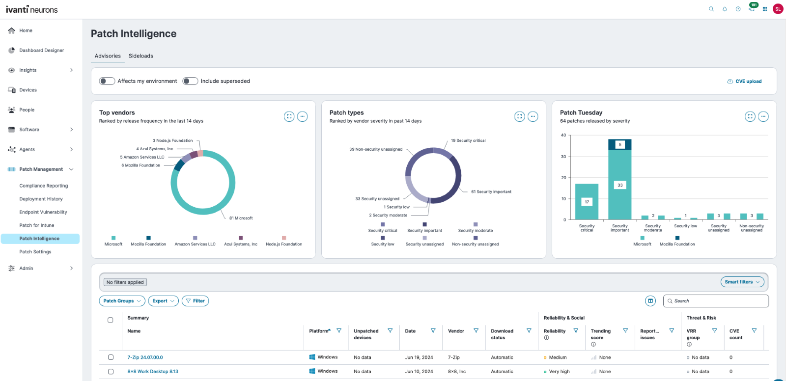 Ivanti Neurons for Patch Management | N/A | Ivanti Neurons for Patch Management is a risk‑based cloud patch management solution used to prioritize and patch vulnerabilities based on active risk exposure, patch reliability and device compliance. | N/A | |