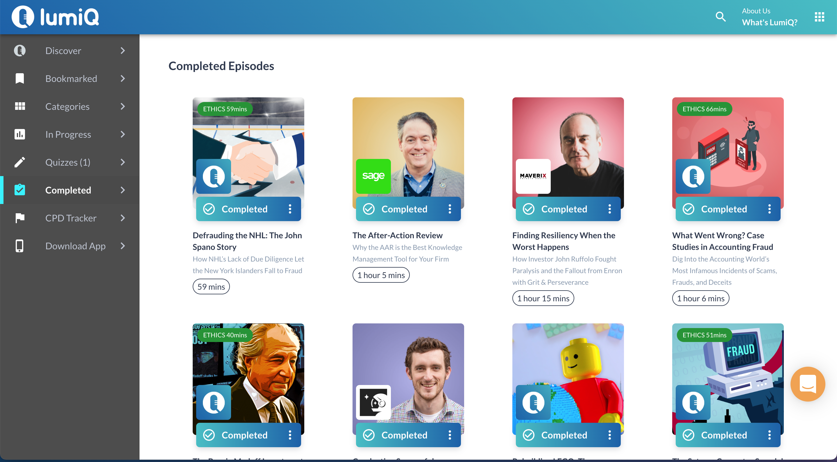 LumiQ | N/A | LumiQ is an online learning platform where podcasts and videos count as verified CPD/CPE for CPAs. Featuring conversations with leading figures at companies including Slack, TD, Blackberry, IBM, Microsoft, and Uber. LumiQ provides CPAs a platform where they can earn CPD/CPE from anywhere. Its mobile app and web player allow for listening on the commute, at the gym, folding laundry, or walking the dog. | N/A | |