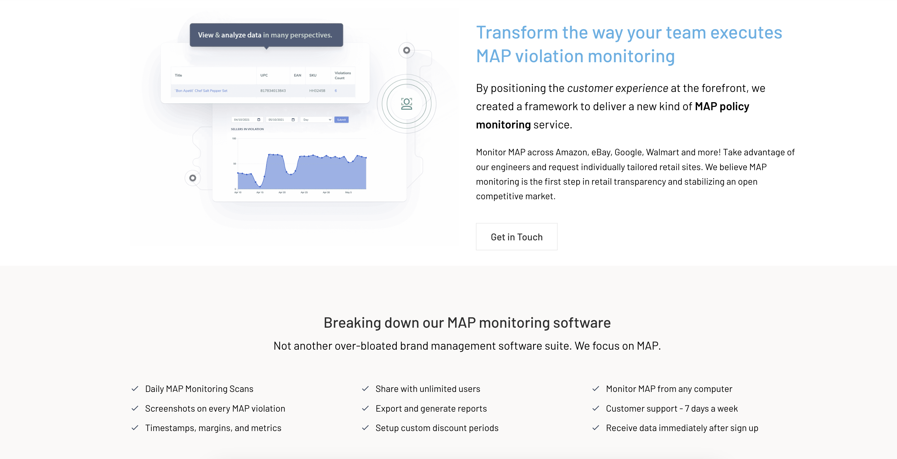 MAP Policy Partners | N/A | MAP Policy Partners brings 15 years of experience into an automated Minimum Advertised Price (MAP) monitoring solution engineered to detect, investigate, and enforce MAP violations. MAP Policy Partners is a family-owned and operated business with a mission to provide a customized one-to-one solution for their MAP partners. The service provides: Automated e-mail reports In-house investigation team Timestamps, margins, and metrics Send physical… | N/A | |