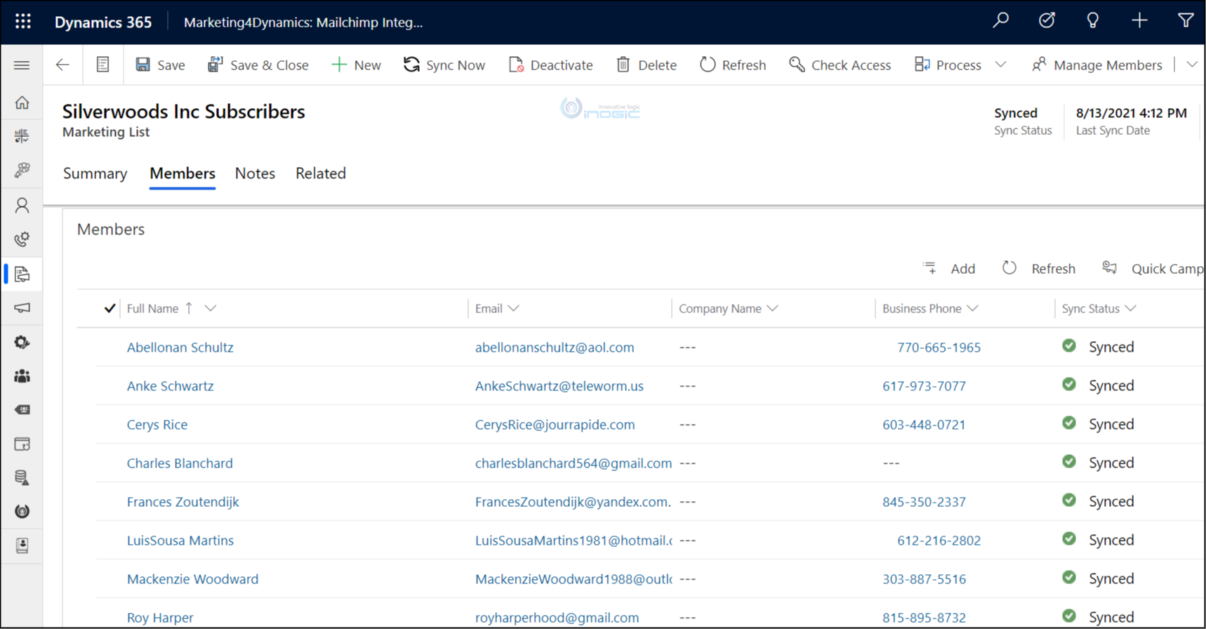 Marketing4Dynamics | N/A | A tool to sync Mailchimp and Dynamics 365 CRM data Marketing4Dynamics is a productivity app providing integration between Dynamics 365 CRM and Mailchimp. It syncs Mailchimp and Dynamics 365 CRM customers with their marketing statistics data ensuring access to information without navigating from one application to another. Complete details of campaigns and other member activities executed through Mailchimp is made available within Dynamics 365 CRM. | N/A | |