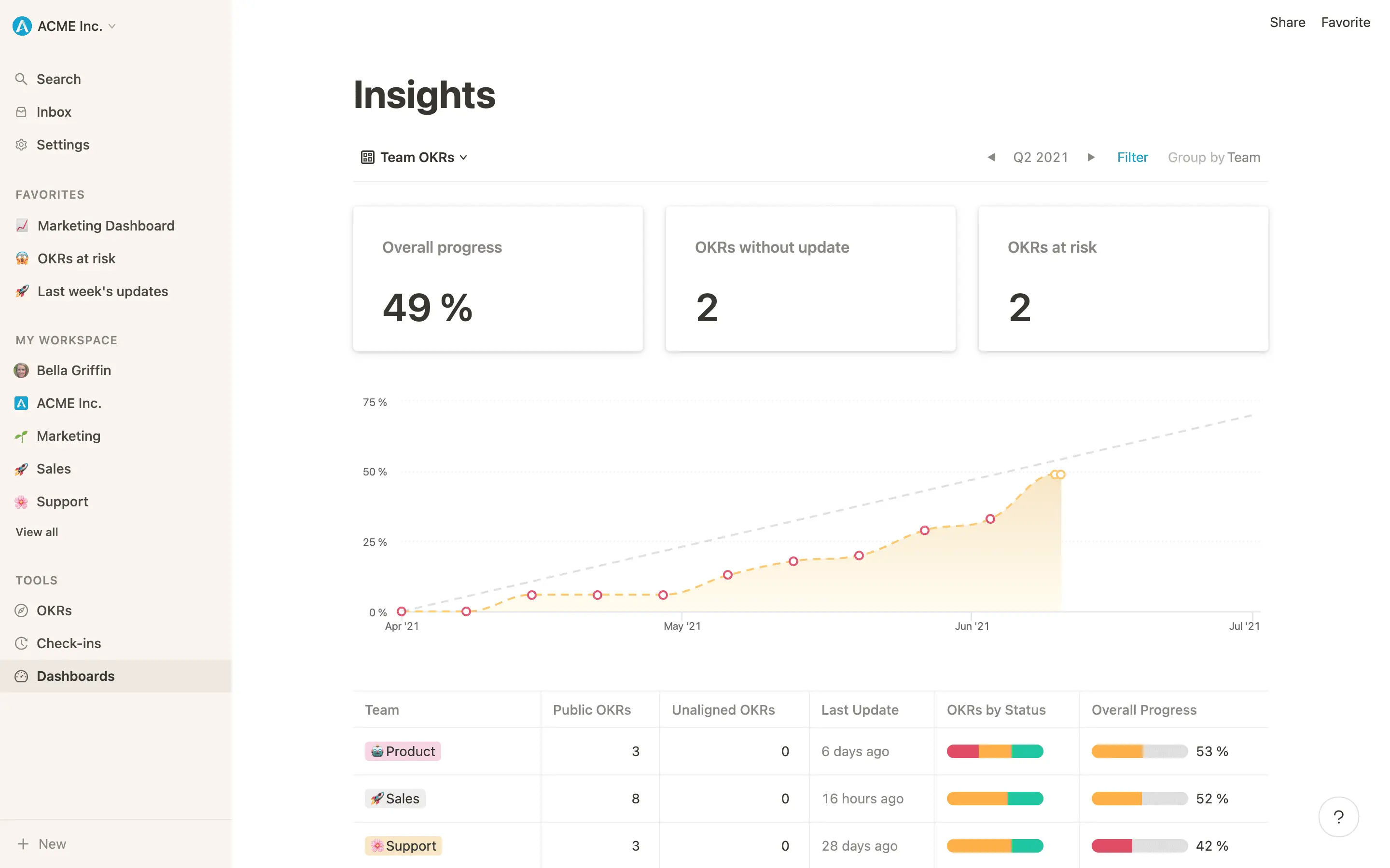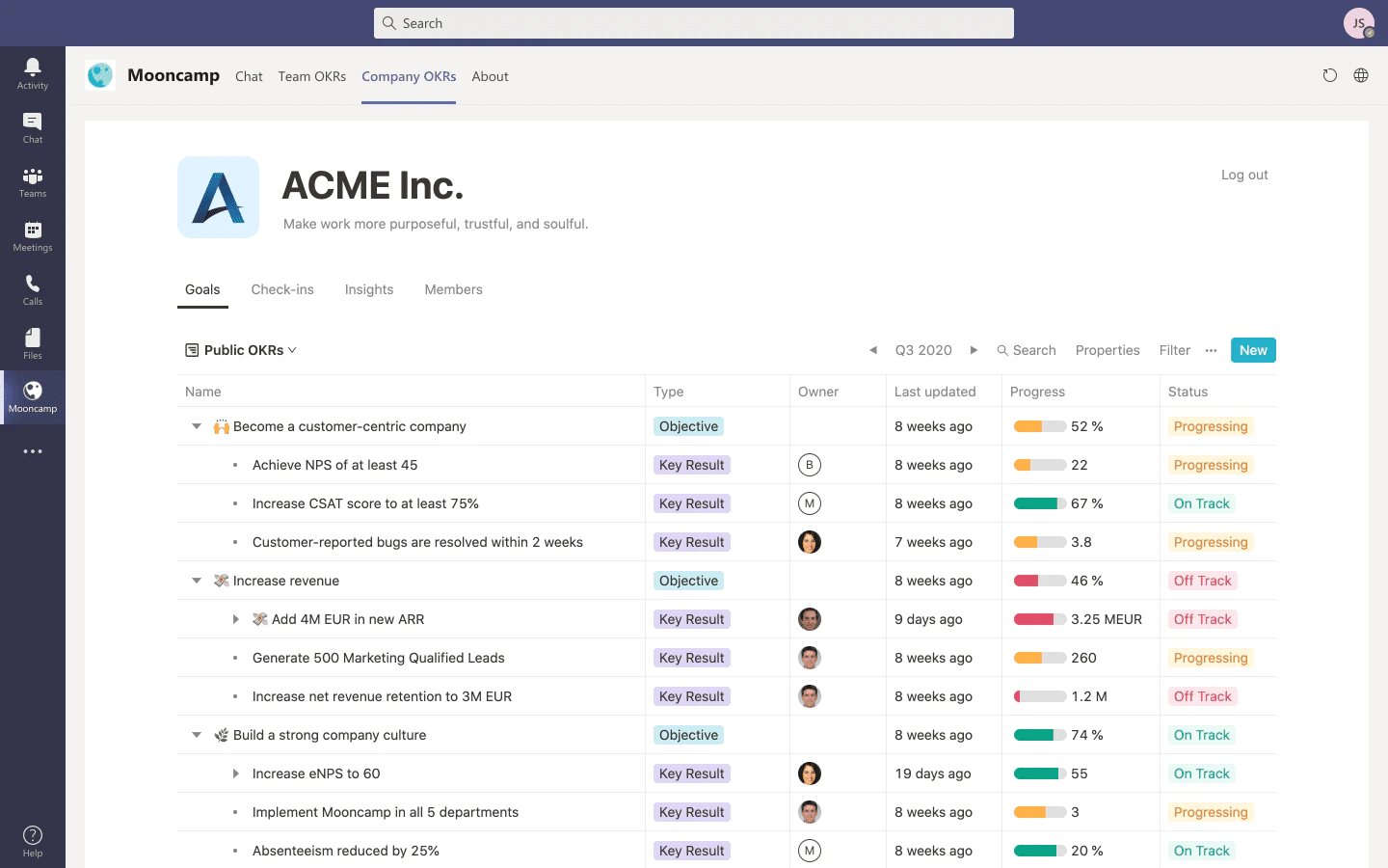 Mooncamp | N/A | Mooncamp is presented as an operating system to develop healthy, happy, and high-performing company cultures with OKRs, and Check-ins. | $6 per user per month | |