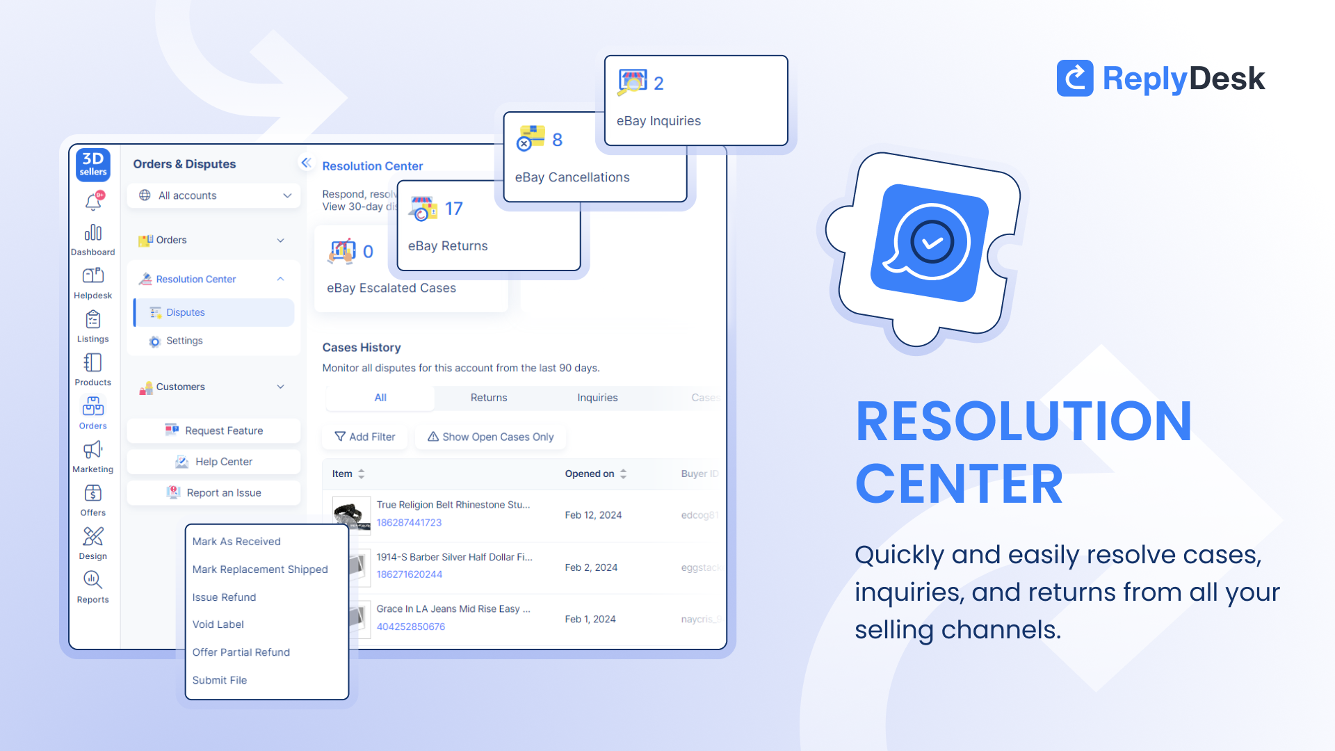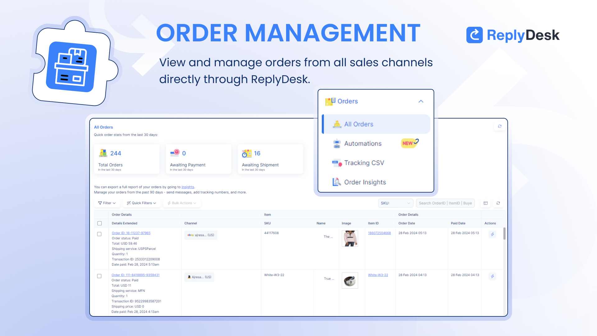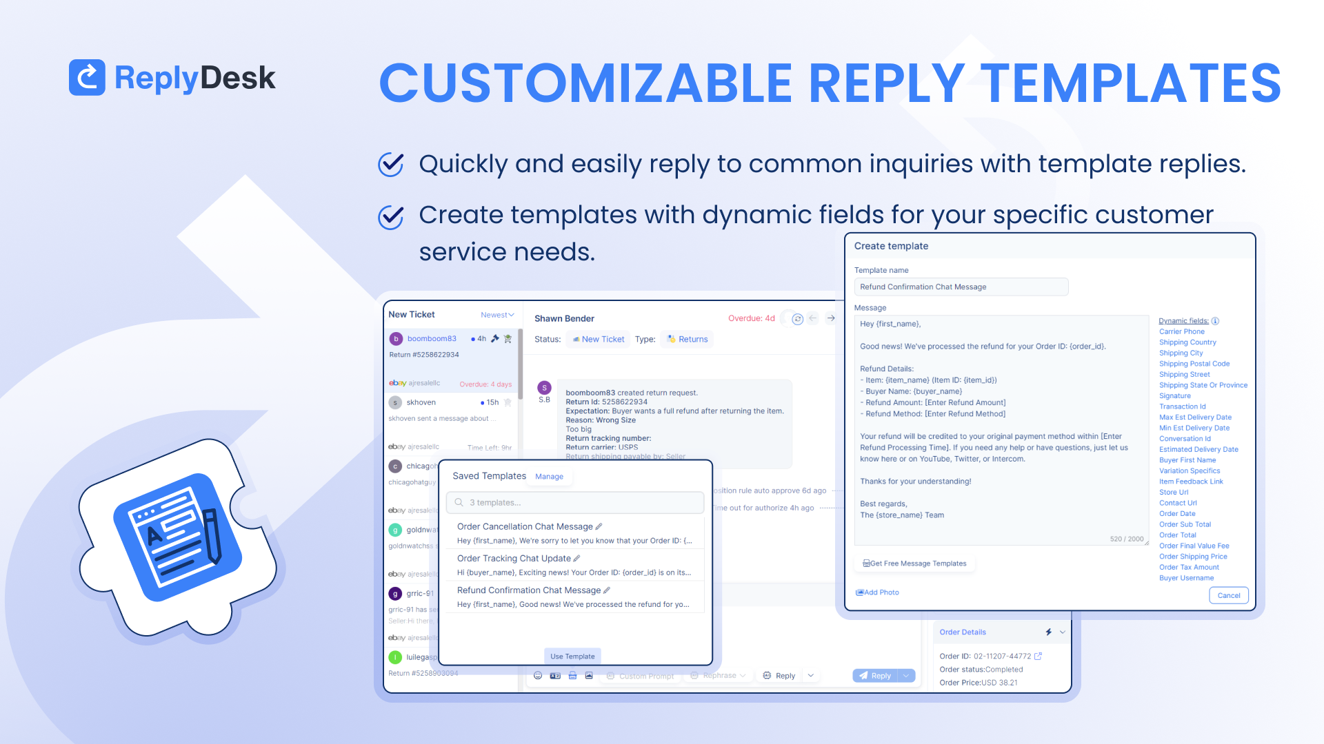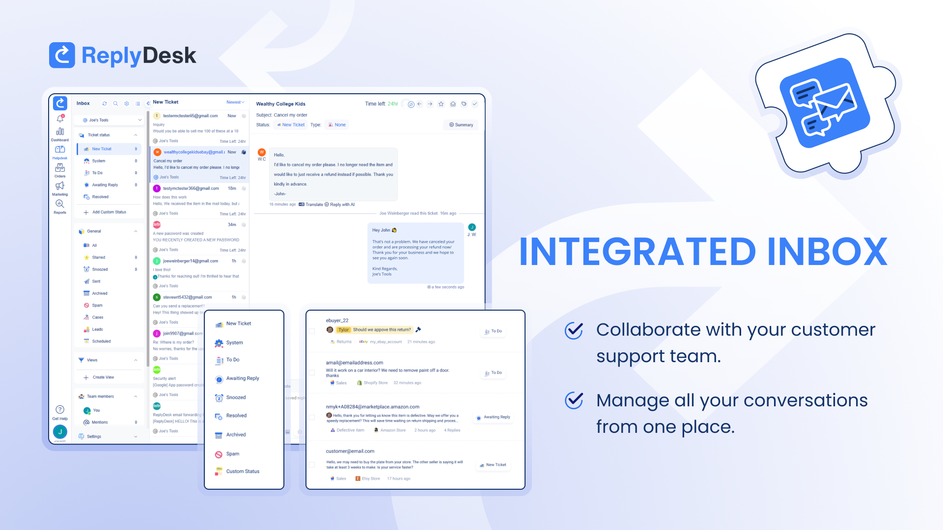 ReplyDesk | N/A | ReplyDesk is an ecommerce helpdesk and multichannel order management solution designed for ecommerce sellers. It's an integrated multichannel inbox with a range of help desk tools that empower sellers to better manage their customer service through more efficient ticket management and communication. With a selection of automated help desk and AI tools, including automatic ticket assignment for multi-agent service teams, AI-generated ticket summaries and responses, SLA timers, and custom… | $0 for 1 agent, with 2 selling channels |