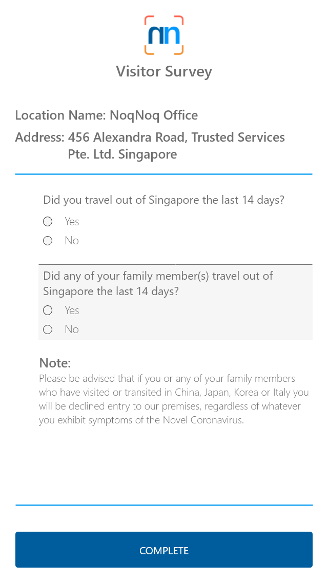NoqNoq | N/A | NoqNoq offers a cloud-based visitor registration/contact tracing system that is easy to implement. It is designed to allow administrators to contact-trace location, time, and date easily, without needing to pay an external party to do it. The system allows visitors to check-in using a QR code or by manually entering their information into a tablet or computer. This information is then securely stored in the cloud, making it easy for organizations to track and manage their visitors. | $9.97 per month | |