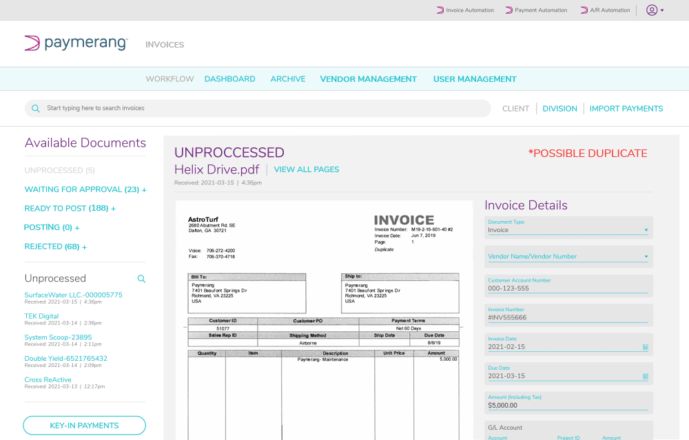 Paymerang | N/A | Paymerang provides a streamlined invoice and payment automation platform that brings Accounts Payable (AP) departments into the modern age. Paymerang's platform saves AP departments thousands of hours annually, enhances visibility, increases accuracy, improves efficiency, and earns rebates while reducing paper, fraud risks, and operating costs. | N/A | |