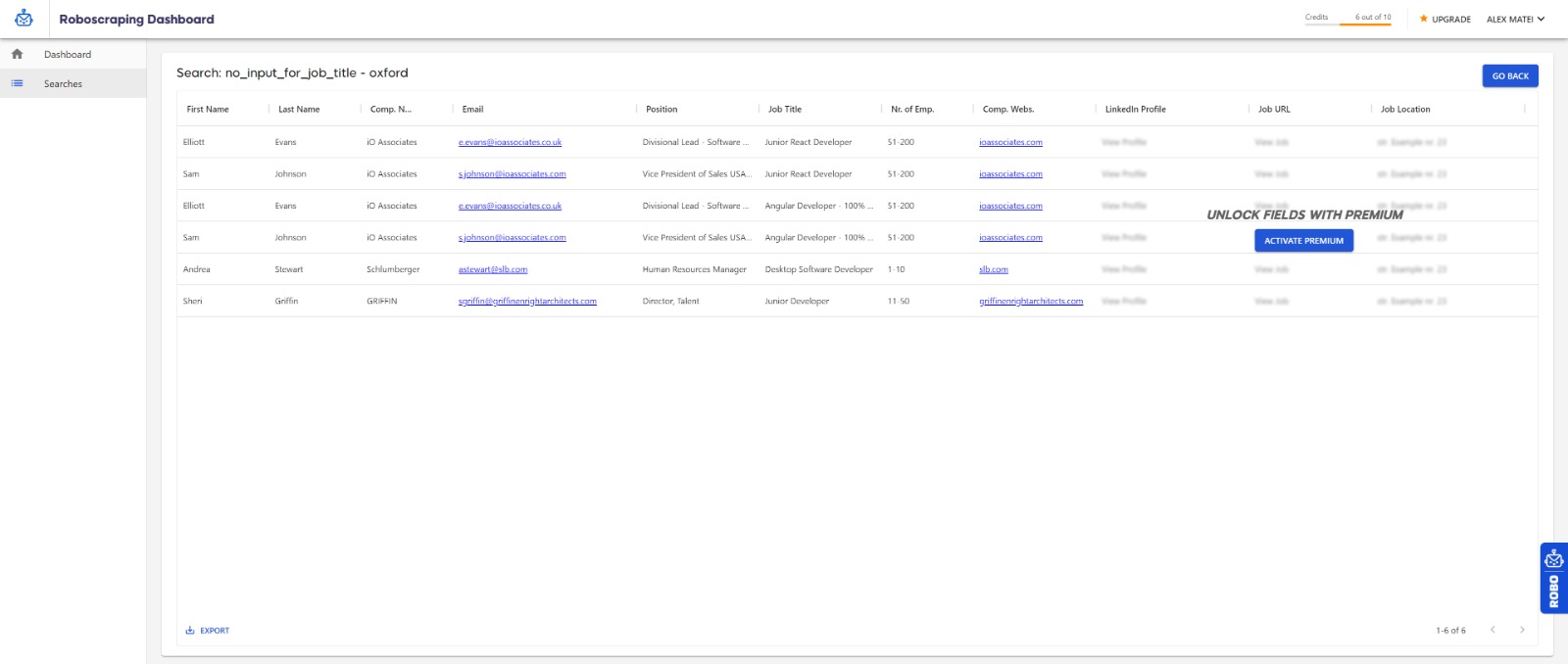 Roboscraping | N/A | Roboscraping is a Saas tool that helps recruiters and consultants to connect with decision-makers who posted jobs on the indeed portal. Roboscraping team aims to reduce the time spend by staffing firms in finding the right prospect for their business. Features: - Get a verified email address - Export the data in CSV format - Lead generation tool designed for recruiting business - Email/Chat Support | $109 per month per user | |