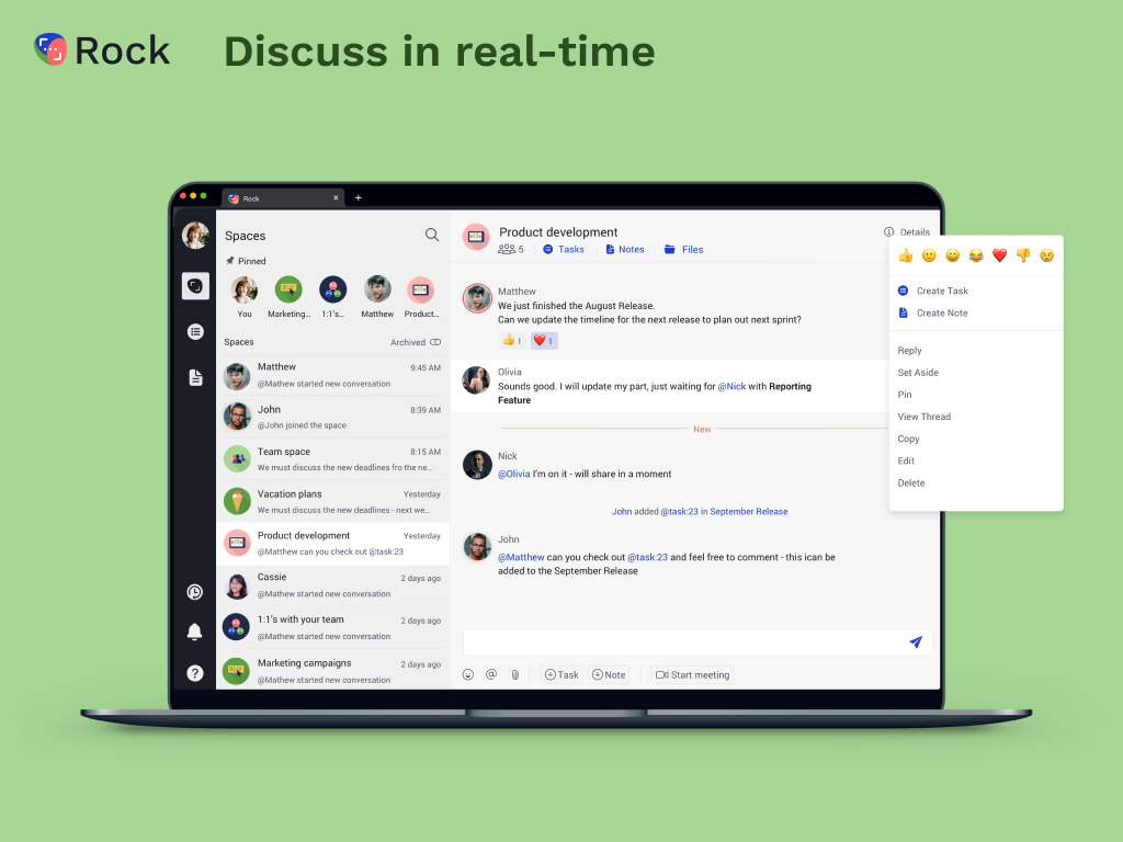 Rock | N/A | Stop slacking, start rocking Rock is an all-in-one productivity app for teams, combining messaging and video calls with tasks, notes and files with integrations with Google Drive & Zoom. Synchronous when needed, asynchronous by default. The solutions is designed to help users minimize distractions and take control of work by cutting out unproductive meetings while shifting towards more productive ways of communicating. Purpose-built for remote work Existing… | $4.99 |