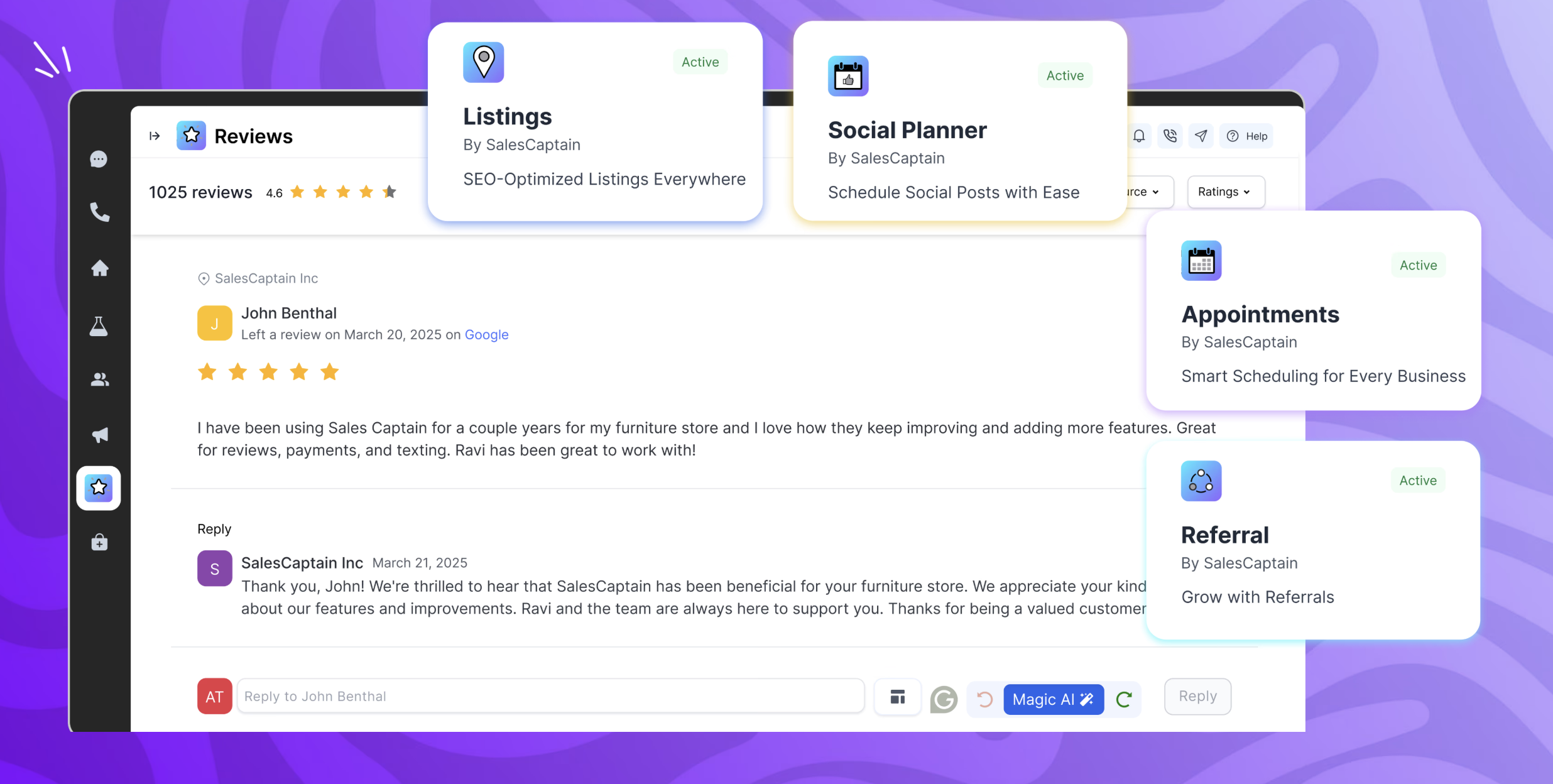 SalesCaptain | Small Businesses (1-50 employees) | SalesCaptain is a communication platform with a chat based AI agent builder, designed for modern businesses. It unifies phone calls, texting, webchat, and social media messaging into a single collaborative inbox. SalesCaptain can be used to create AI-powered phone and text agents to handle calls, answer queries, route leads, filter spam, and automate tasks — without any technical expertise. SalesCaptain also includes a suite of built-in business apps for managing… | $159 per month per installation | |
