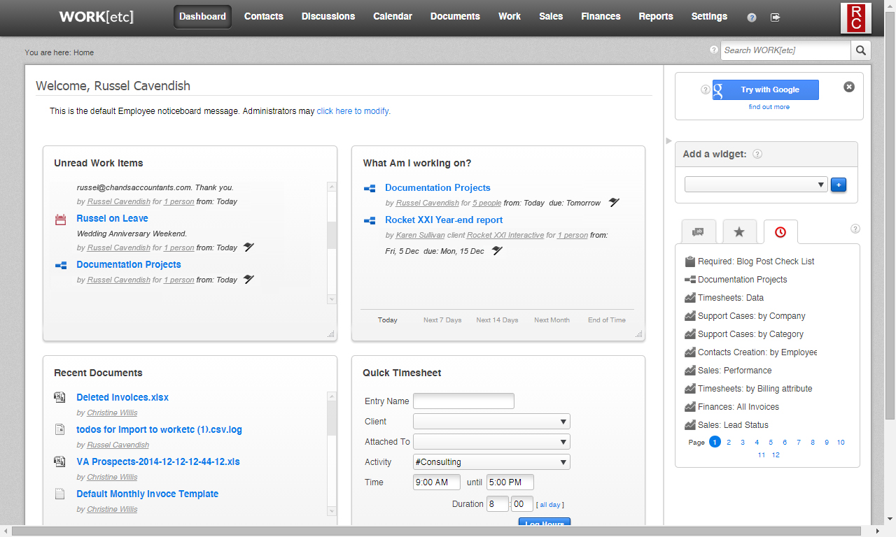WORKetc is a cloud-based business management system. With integrated CRM, project management, billing, help desk, reporting, and collaboration, teams can access one system for all relevant information. The system supports popular third-party apps such as Google Workspace, Xero Accounting, Quickbooks Online, Outlook, Dropbox, and Evernote.
