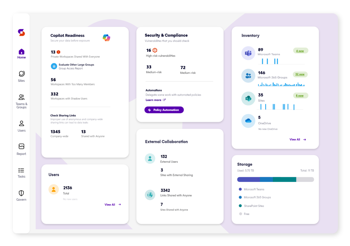 Syskit Point | N/A | SysKit Point is a Automated Office 365 Governance and Security tool, from SysKit in Zagreb. It is designed to enable users to get a full overview of an Office 365 environment and ownership across Microsoft Teams, SharePoint Online, Office 365 Groups, and OneDrive in a central web interface. With it, the vendor says users can create easy-to-read security reports and proactively manage users and access. | $1 per month |