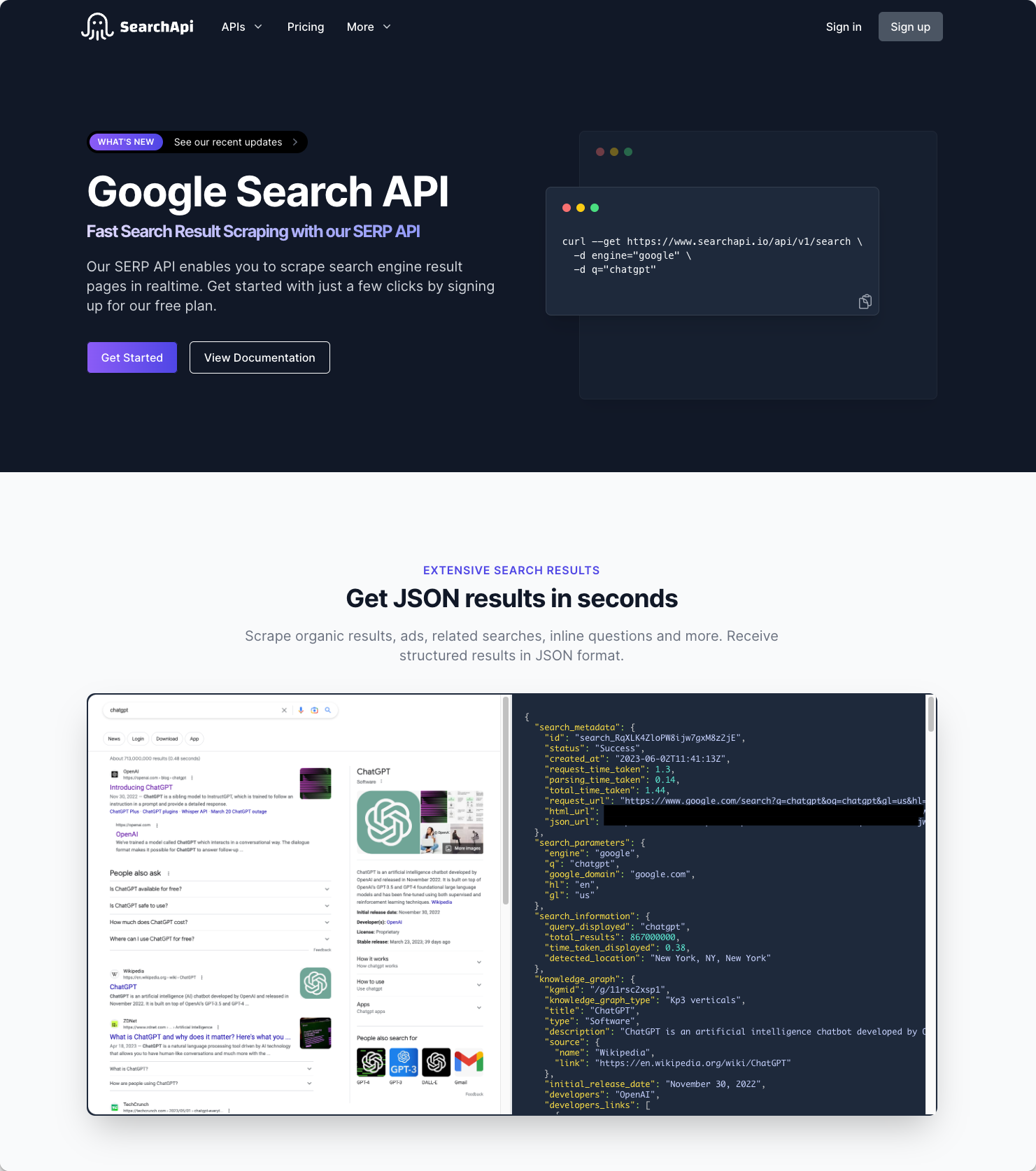 SearchApi | N/A | SearchApi is a real-time SERP API delivering structured data from search engine results pages. Supported search engines: Google Search API Bing SERP API Baidu Search API Google Scholar API Google Jobs API Google Trends API Google Play Store API Apple App Store API Google News API Google Images API Youtube Search API Google Shopping API Amazon Search… | $40 per month 10,000 searches per month | |