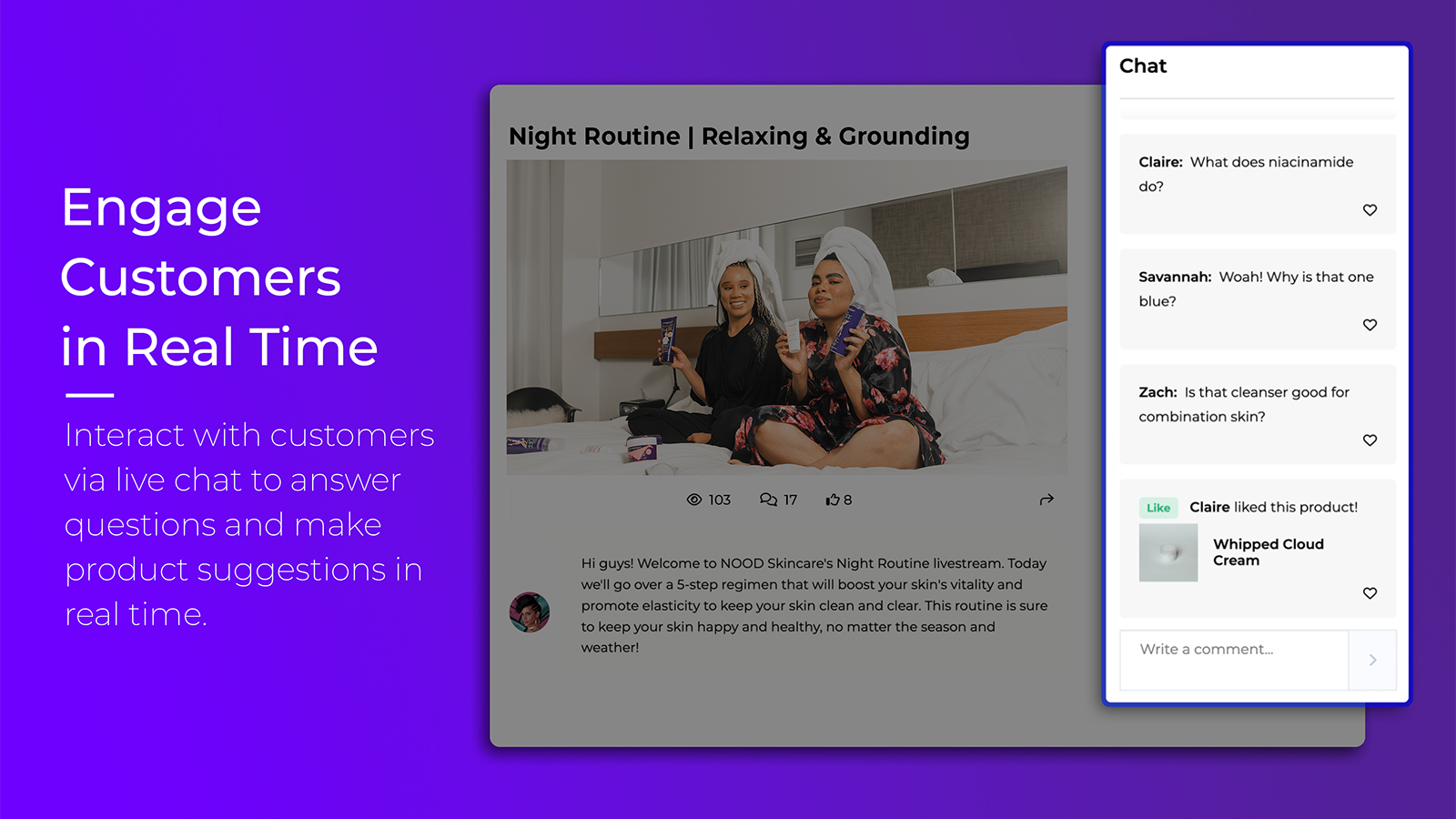 Social Chat | N/A | Social Chat helps brands to forge meaningful connections with their customers. Through Live Commerce - embedding Live Video Shopping into customers' purchase experiences - brands can create onsite communities where customers can learn, converse and connect with the brand. In turn, brands get the data behind the interactions and conversions to further optimize the experiences for the users both on the site and through CRM channels for best-in-class branding and performance ROI. Social… | $49 per month | |
