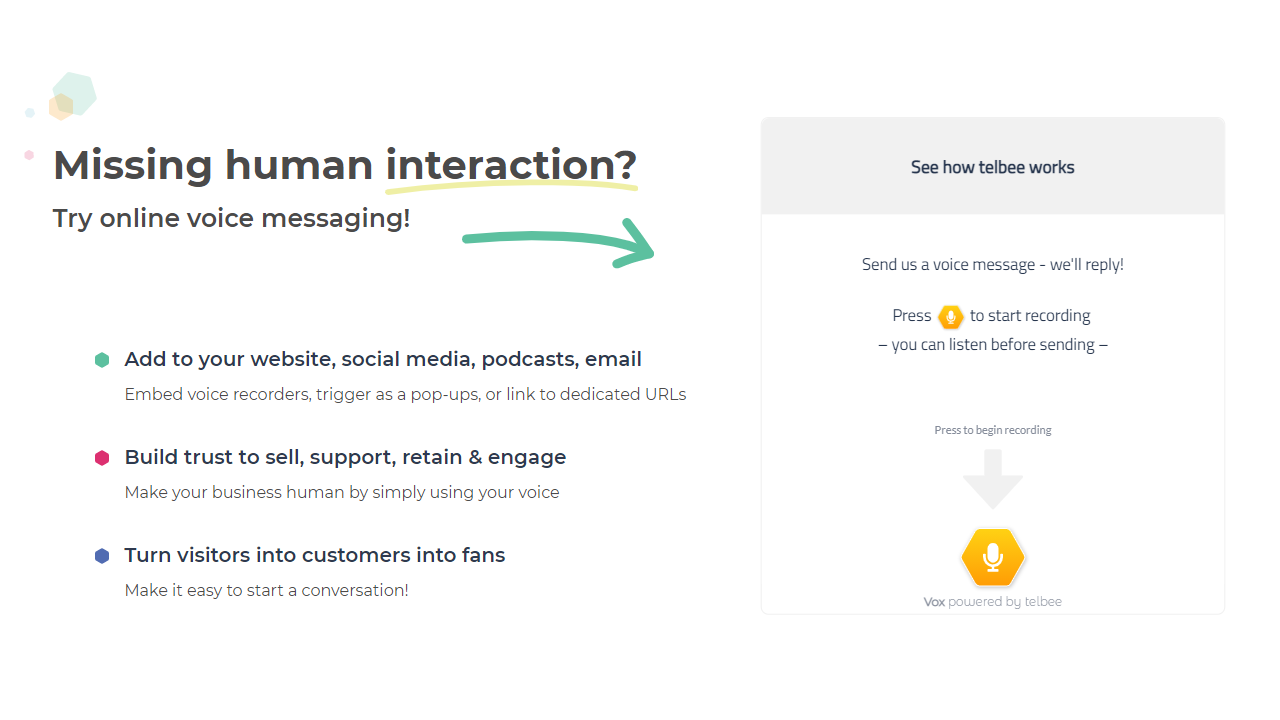 telbee | N/A | telbee adds voice messaging to a website, or lets the create standalone voice recorder URLs to share via social media, podcasts, emails, or QR codes. Designed to enable visitors, customers and community can speak their mind easily when it's convenient, then get on with their day. The user can listen to their messages or read them transcribed in 50+ languages, whether in a team inbox, in an email client or anywhere else via Zapier. Then continue the conversation by voice - adding text,… | N/A | |