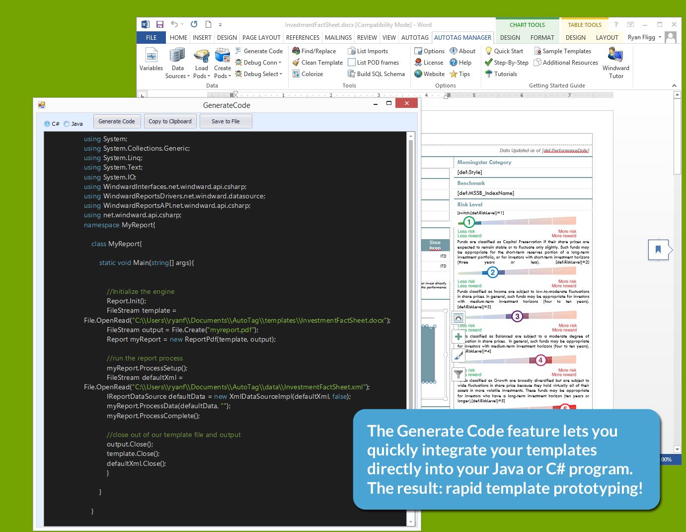 Great for Technical Users. It's great for people a bit more on the technical side. It allows developers to quickly create and modify reporting templates without having to modify source code or make updates to a repository. Potentially Difficult for Non-Technical Users. Making substantial changes to the data portions of reporting can be a bit difficult for non-technical users. While Windward's tools for this are great, it still requires an understanding of the database schema which not all users will have.