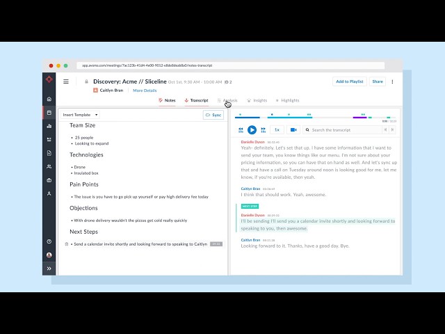 Its AI-powered technology help customer-facing teams capture important customer information, before, during, and after meetings. Avoma analyzes conversation insights, and intelligence to help reps shorten sales cycles and delight more customers. Team members can automatically record all meetings, get full transcripts and summarized notes, and actionable insights synced directly to the CRM. Also, review calls and meetings by searching directly within transcripts and using identified topics to find exactly what you're looking for.