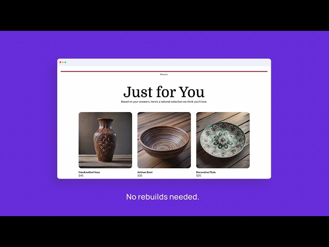Every quiz and product finder is designed to match the host site, not a generic template. Cartful’s no-code visual editor lets teams build and update experiences independently, without design or development resources. Experiences deploy anywhere you can embed a snippet and reflect the brand’s design standards. Shoppers never feel like they have left the site.