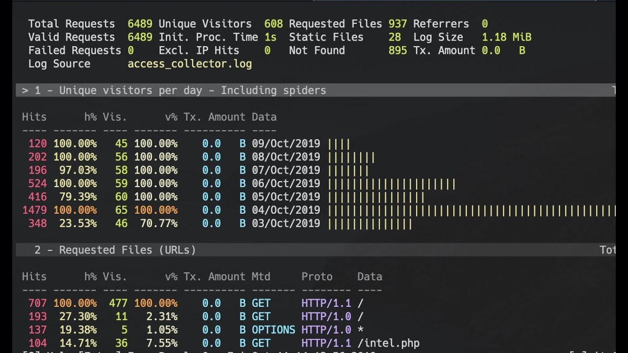 GoAccess was designed to be a fast, terminal-based log analyzer. Its core idea is to quickly analyze and view web server statistics in real time without needing to use a browser (useful for a quick analysis of accesss log via SSH or when preferring to work in the terminal. While the terminal output is the default output, it has the capability to generate a complete, self-contained real-time HTML report (great for analytics, monitoring and data visualization), as well as a JSON, and CSV report.