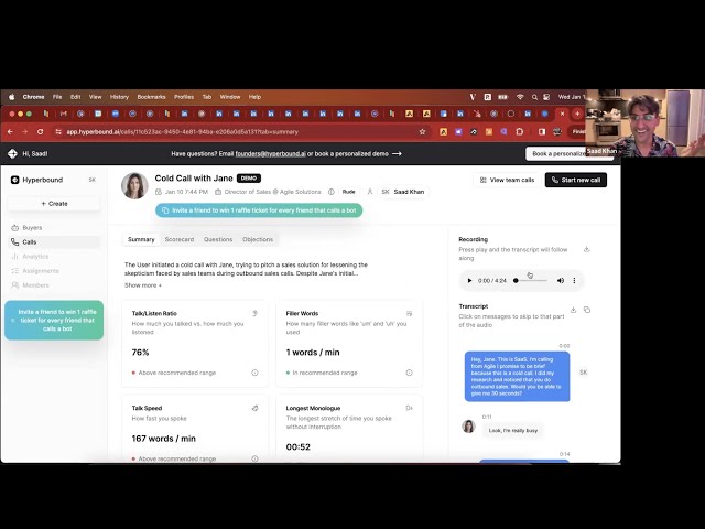 Hyperbound AI analyzes an organization's sales calls, uncovers why its top reps win, and builds AI roleplays to help quickly evolve and reinforce playbooks. This AI Sales Roleplay technology supports mid-market/enterprise revenue teams in the process of upskilling and preparing their workforces.