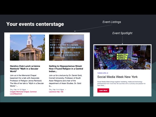 Localist headquartered in Silver Spring offers an event marketing application ,which they describe as a community event platform that brings people together virtually, or in-person. Localist features event branding tools, landing pages and registration for interacting with potential attendees, channels for segmenting events and attendees and tuning messaging.
