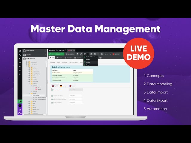 Consolidates data across complex, heterogeneous system landscapes. The Pimcore MDM is used to manage all aspects of any master record, including hierarchy, structure, validation, versioning, and enrichment with attributes, descriptions, translations, documentation, and other related data.