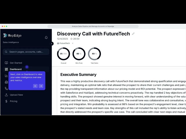 RepEdge.ai analyzes every sales call (Zoom, Meet, Teams), predicts win probability, gives personalized coaching on every single call, and pushes everything straight into Salesforce & HubSpot. The vendor states their tool achieves 95% accurate win-probability scoring.