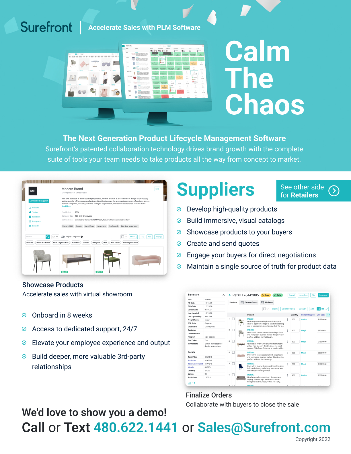 Surefront is a comprehensive product collaboration platform that integrates Product Lifecycle Management (PLM), Product Information Management (PIM), and Customer Relationship Management (CRM) to enhance various business processes such as merchandising, product development, vendor management, and sales management.
